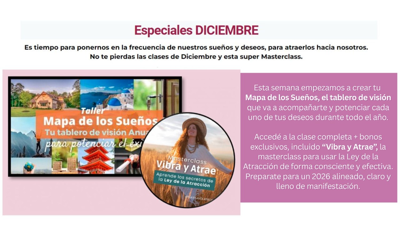 Si querés llevar tus metas y sueños al próximo nivel, te invito a ser parte de nuestro Taller Digital "El Mapa de los Sueños", un ritual transformador que repetimos cada año para enfocarnos en nuestros deseos y objetivos más importantes.